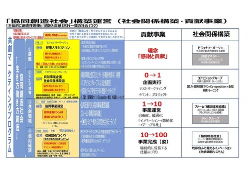 『生き方働き方創造』 (協同創造社会の構造) 理念「感謝と貢献」を自らの言葉で明らかにして言行一致していく反復学習と実践 【0→1 企画実行】 多種多様多彩なイベント、プロジェクトを起点 →コアビジョングループ形成へ 【1→10 事業運営】 ミニ経済(…
