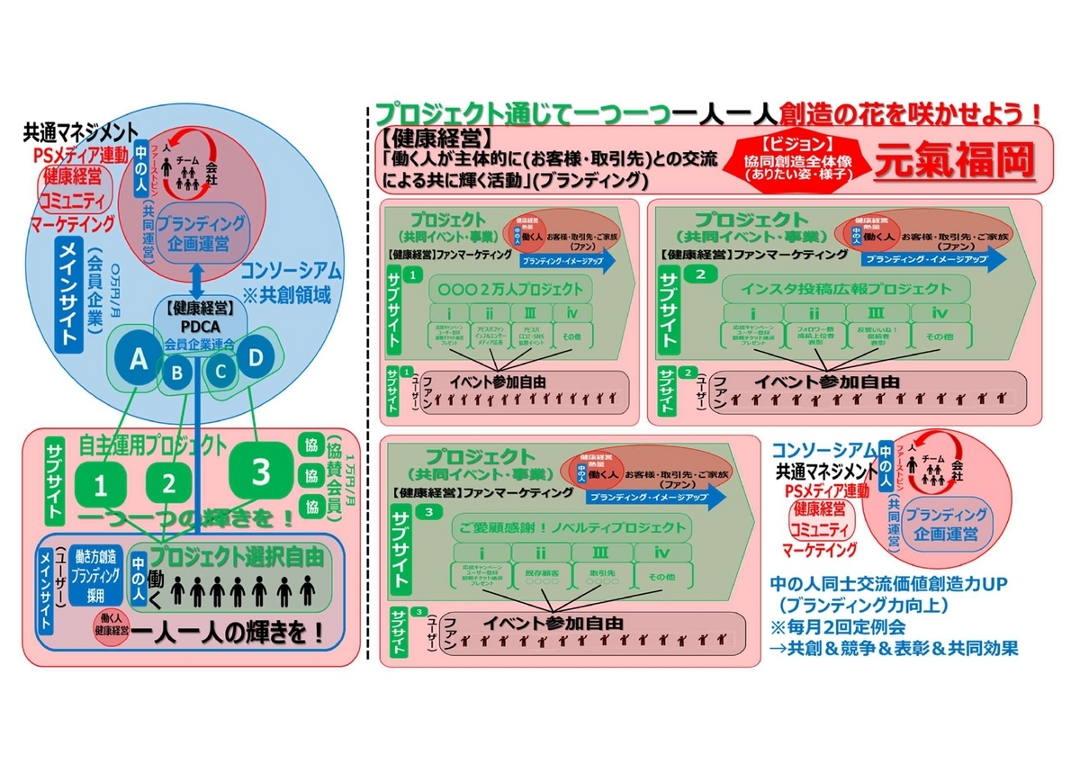 2023-10-05 健康経営文化形成貢献メニュー「松竹梅」 健康経営文化形成貢献メニュー「松竹梅」 松 【健康経営】プラットフォーム『協同創造』 竹 適職斡旋福利厚生 梅 PSメディア連動(健康経営コミュニティ)マーケテイング※共通マネジメント
